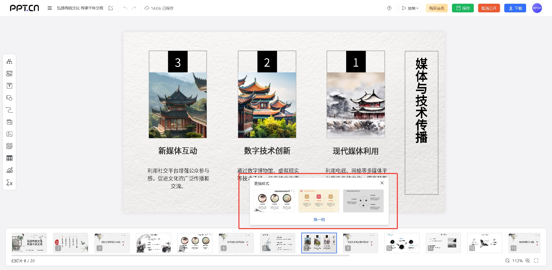 生成的PPT里,页面用的是素雅的色调,搭配了类似水墨笔触的图案和留白,整体看起来就是我要的那种高级感。之前我自己做PPT,最烦的就是找图,这次发现网站自带的图片库里就有不少能用的图片,比如茶叶、茶具、山水意境图,都是高清可商用的,选中后一键就能替换进去,省去了到处找图还担心版权的麻烦。