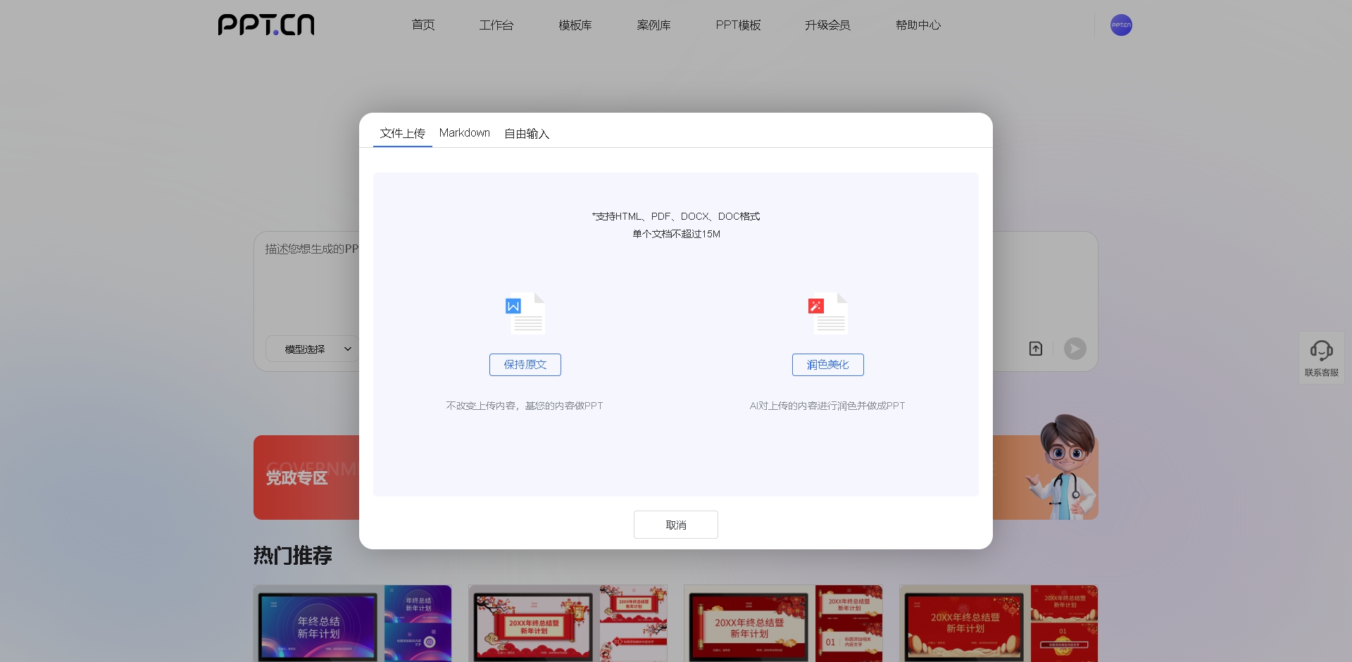 我当时做文创市集艺术分享PPT,手里已经有现成的word文案了,里面整理了市集的主题、参展的文创作品、艺术亮点还有分享流程,本来以为要逐字逐句复制到PPT里,再一点点排版,没想到这个网站直接就能解决。首先打开ppt.cn官网,登录之后点击“文件上传”按钮,我点进去,选了润色美化(AI对上传的内容进行润色并做成PPT),上传了手里的文创市集word文案,直接AI生成,不用自己手动梳理逻辑,真的太省心了。