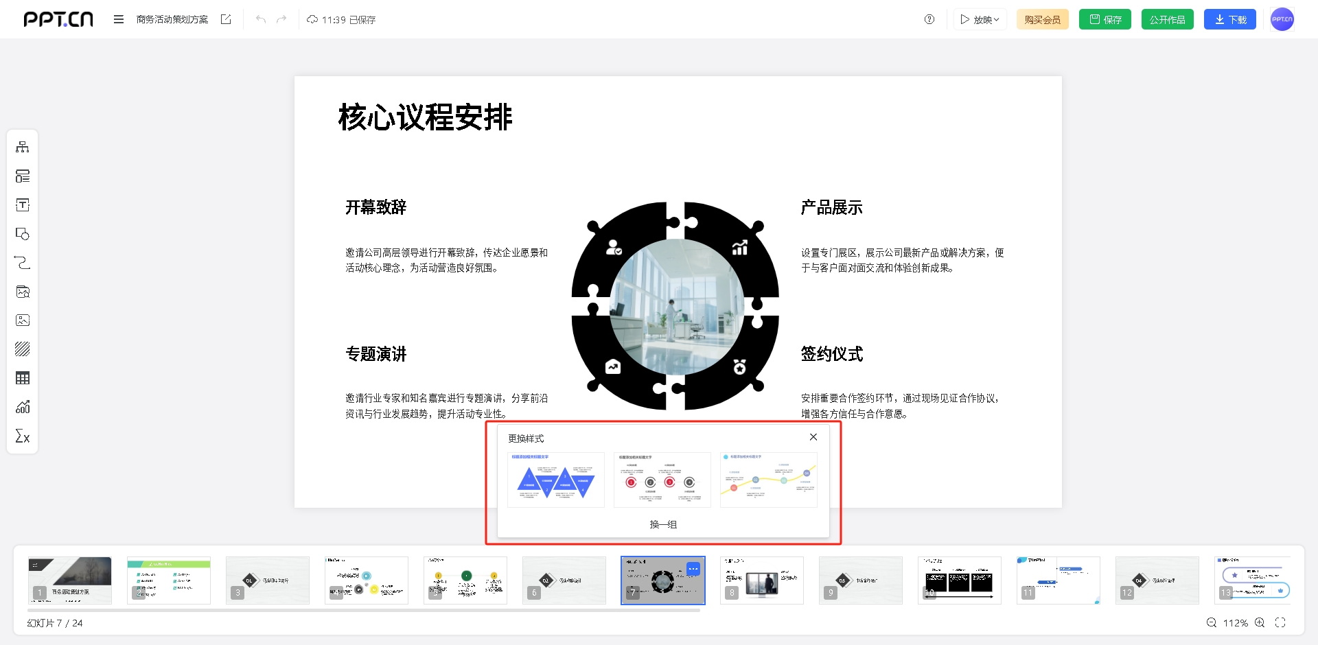 最省时间的是它的AI排版和配色,暗黑风最容易踩的坑就是颜色发闷、文字看不清,这个网站生成的PPT,背景和文字对比度刚好,字体搭配也很协调,不用自己一点点调参数。要是觉得某一页不满意,直接点击页面在“更换样式”里选择喜欢的样式一键应用,它立马就能给出修改后的版本,不用重新做。